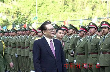 國家主席江澤民在澳門回歸之日親臨解放軍駐澳部隊營地,檢閱剛剛進駐的將士們。 中新社數碼傳真 王瑤攝