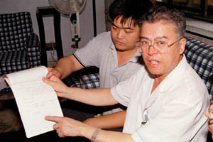 李洪志曾住院手術(二) ![]() 8月3日,吉林省人民醫院發現李洪志曾在該醫院做過闌尾炎手術的住院病歷。李洪志在1984年7月8日早晨突 發急性化膿性闌尾炎,住進吉林省人民醫院普通外科,發燒38.9度,于當天下午實施闌尾切除手術,住院10天。由于當 時醫生筆誤,錯將李洪志寫作“李宏志”,根據病歷上的患者年齡、工作單位、家庭住址及家屬(李妻)的手術簽字,可確定 患者即李洪志。圖為當時為李洪志做手術的主治醫師、現吉林省人民醫院副院長李英杰(右)講述當年為李洪志確診手術的情 景。張寶江攝(新華社稿 傳真照片) |
