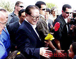 江澤民主席十四日在以色列參觀類似中國“人民公社”的農(nóng)莊——基布茲,接受兒童的獻花。中新社記者:彭偉祥