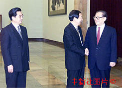 中國國家主席江澤民,二十八日結束對亞歐非六國的訪問回國,國務院總理朱(金加容)基、國家副主席胡錦濤到人民大會堂迎接。中新社記者 滿會喬 攝