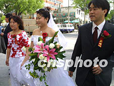 圖:北京另類(lèi)新人“走婚”創(chuàng)紀(jì)錄 2002年05月07日 20:25 ![]() 五一假期,一對(duì)身穿禮服的新人舍棄豪華婚車(chē),在家人陪同下從洋橋家中走到西單舉行婚禮,在假日婚潮中創(chuàng)造了一項(xiàng)“走婚”紀(jì)錄。中新社記者 鄭萍萍 攝