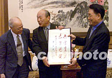 圖:郭東坡會見旅日華僑聯(lián)合總會代表團(tuán) 2002年07月24日 08:24 ![]() 國務(wù)院僑辦主任郭東坡二十三日在北京釣魚臺會見由殷秋雄(左一)、金(羽加軍)(左二)率領(lǐng)的旅日華僑聯(lián)合總會代表團(tuán)。該團(tuán)自1999年以來共捐款210萬元人民幣用于建立希望小學(xué)等項目。作者:鄭萍萍