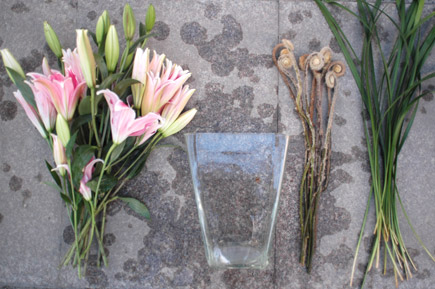 花材:粉色百合、春蘭葉、蕨芽