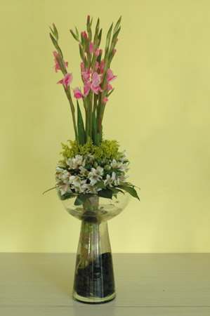 花材:劍蘭、水仙百合、黃鶯、八角金盤、燈臺