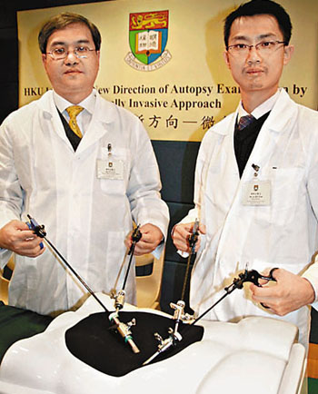 為了讓家屬較易接受驗(yàn)尸,港大外科學(xué)系的微創(chuàng)專家研究利用微創(chuàng)技術(shù)驗(yàn)尸,在腹部開四至五個(gè)直徑0.5至1厘米的傷口,利用腹胸腔鏡或內(nèi)窺鏡檢視胃、肝、腸和胰臟等胸腔內(nèi)的器官以尋找死因。