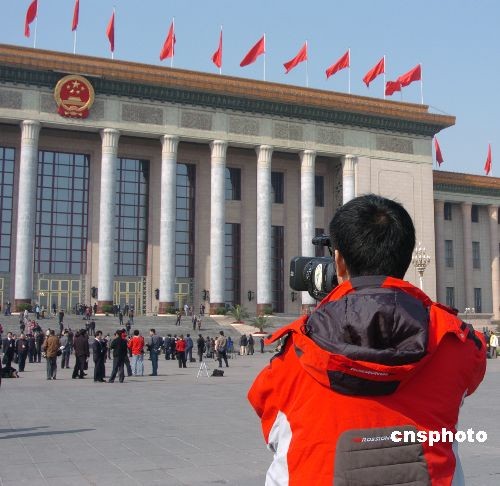 2008兩會召開期間,中外記者們奔波于人民大會堂、委員和代表們的住處,收集新聞線索,及時發回最新的會議動態和熱點、焦點話題。中新社發 毛昭勝 攝
