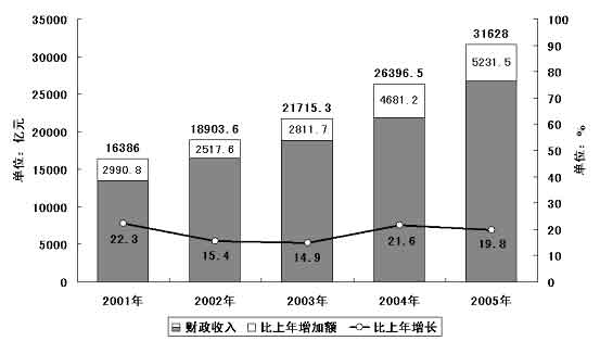 圖表二 “十五”期間全國財政收入及其增長情況