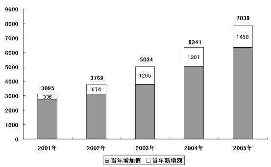 圖表四 “十五”期間規(guī)模以上高技術產(chǎn)業(yè)增加值增長情況 (單位:億元)