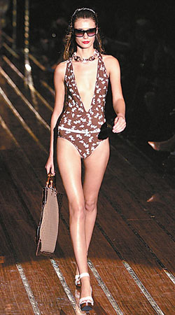 中新網4月13日電  據廣州日報報道,早在上個季末各大時裝周發布2006年春夏時裝上,Gucci、JeanPaulGaultier等國際大品牌和設計師便已經將精心設計的泳裝新款呈現于觀眾面前。隨著夏天的臨近,從近期巴塞羅那、里約熱內盧的泳裝秀上看到,今年春夏的泳裝新品更加年輕化,其中,年輕美眉熱愛的清純、度假、叢林以及鄉村這四大風格的泳裝備受關注。