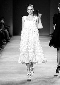 這一季的流行回歸到最單純的白色,但今夏的白色與往年大不相同。相比以往白色服飾給人的純潔印象,今年的白色系列挖掘的是白色性感的另一面:雪紡和蕾絲下面是十足的透明誘惑;鏤空、雕花、綴邊的“拼接”勾勒出女人的完美曲線;關注細節的刺繡、鑲嵌帶來的視覺感受,讓人回味無窮的精致性感……