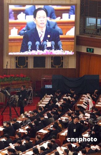 3月10日上午,十一屆全國人大一次會議第三次全體會議在北京人民大會堂舉行,全國人大代表聽取最高人民法院院長肖揚作最高人民法院工作報告。中新社發 張宇 攝