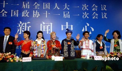 三月十日下午,八位出席十一屆全國人大一次會(huì)議的少數(shù)民族代表,在北京兩會(huì)新聞中心接受中外媒體集體采訪。中新社發(fā) 王東明 攝
