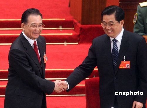 溫家寶再任國務院總理 胡錦濤主席握手致賀