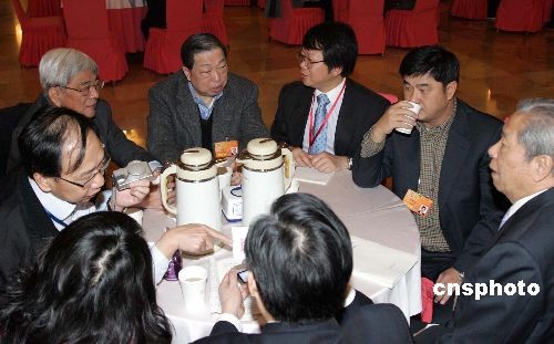三月九日,來自香港特區的全國政協委員施子清、黃楚標、鄒燦基、施展熊、李群華等(后排右起),在北京人民大會堂圍圓桌而坐議政。中新社發 潘索菲 攝