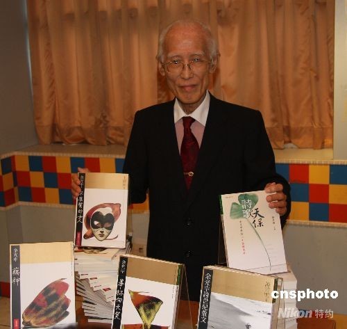 為祝賀詩人余光中八十大壽,臺灣九歌出版社特意出版余光中最新詩集《藕神》、近十年的文學評論精選《舉杯向天笑》、翻譯英國名作家王爾德的劇本《不要緊的女人》等五本書,展現他在文學路上的成就。十月二日,臺灣藝文界提前為他祝壽,余先生在五本新書前留影。中新社發 耿軍 攝