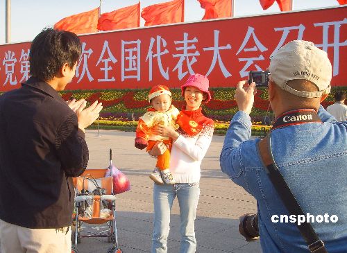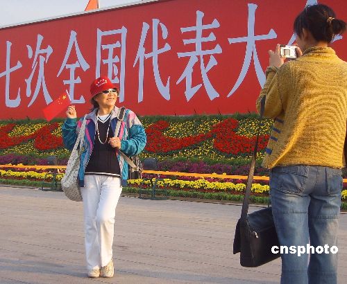 10月21日上午,黨的“十七大”在北京勝利閉幕,來自四面八方的游客感到無比高興、鼓舞,紛紛快樂地在花團錦簇的北京天安門廣場拍照留影,記錄下這有意義的時刻。中新社發 玉龍 攝