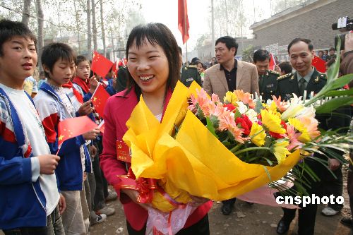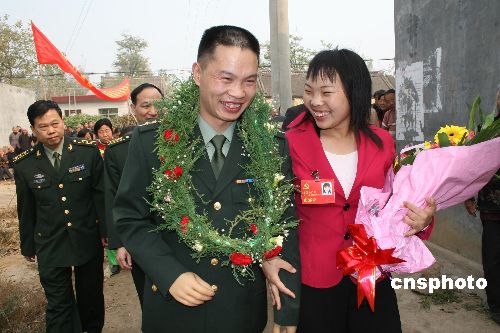 10月23日,出席黨的十七大的河南代表團(tuán)代表吳新芬回到家鄉(xiāng)禹州市朱閣鄉(xiāng)邊樓村,受到家鄉(xiāng)父老的熱情歡迎,當(dāng)日她就把黨的十七大的精神與鄉(xiāng)親們分享。十七大代表吳新芬,是一名來(lái)自河南省禹州市朱閣鄉(xiāng)邊樓村的軍人媳婦。1998年,大學(xué)畢業(yè)不久,當(dāng)她得知西藏某部邊防軍官王俊景在執(zhí)行任務(wù)時(shí)被高壓電擊成重傷,便毅然辭去工作,跑到醫(yī)院照顧,不久后兩人成為伴侶。此后10年,她和丈夫共用一雙手,一起跨越常人難以想象的重重困難,艱苦而幸福地生活。中新社發(fā) 牛書(shū)培 攝