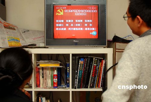 十月二十一日,北京一家住戶中家庭成員關(guān)注中央電視臺新聞聯(lián)播節(jié)目正在播送的新一屆中共中央委員會委員名單。當(dāng)日,中國共產(chǎn)黨第十七次全國代表大會在北京人民大會堂閉幕,新一屆中央委員會和中央紀律檢查委員會經(jīng)選舉產(chǎn)生。中新社發(fā) 廖攀 攝