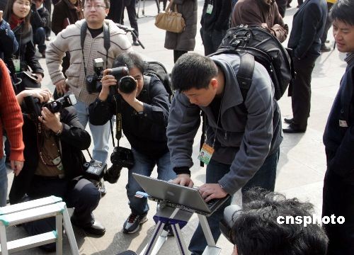 三月十四日上午,全國政協十一屆一次會議在北京人民大會堂閉幕,中新社攝影記者在大會堂外搶發新聞圖片,引起同行興趣。中新社發 潘索菲 攝
