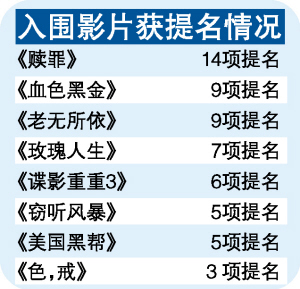 被喻為“英國奧斯卡”的2008年英國影視藝術(shù)文化學(xué)院頒獎禮(BAFTA),前日公布提名名單,《色,戒》報名角逐最佳電影、導(dǎo)演及女主角等11個項目,結(jié)果除了較早前公布入圍最佳新人(湯唯)和外語片之外,只有最佳服裝設(shè)計(樸若木)能獲提名;而凱拉·奈特利主演的《贖罪》,則獲得本屆最多14項提名,成為大熱之選。