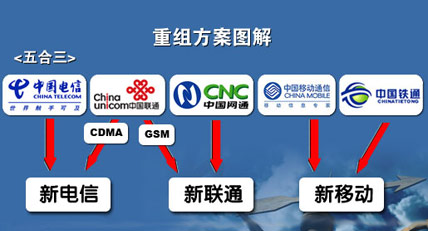 5月23日上午,盛傳已久的中國電信業(yè)第三次重組終于拉開帷幕。重組方案除衛(wèi)通的基礎(chǔ)電信業(yè)務(wù)并入中國電信外,與此前流傳的“五合三”方案大致相同(如右圖所示)。三大運營商人事安排:王建宙出任中國移動董事長兼總裁,張春江任第一副總裁兼黨組書記;王曉初出任中國電信董事長兼總裁,尚冰任黨組書記;常小兵任新聯(lián)通籌備組組長。