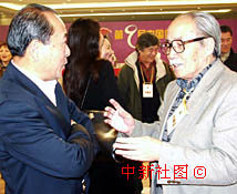 第九屆中國金雞百花電影節頒獎儀式二十一日在廣西南寧市舉行,來自中國各地的著名電影演員匯聚在一起。圖為中國著名電影演員王鐵成和葛存壯在一起交談。中新社記者 錢興強 攝