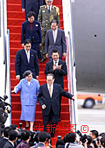 國家主席江澤民與夫人王冶坪在澳門特區行政長官何厚鏵的陪同下,于19日下午乘專機抵達澳門機場,出席澳門回歸祖國一周年慶典活動,江澤民主要陪同人員錢其琛等同機抵達。中新社傳真 滿會喬攝