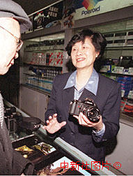 全國人大代表、鳳凰光學(xué)股份有限公司副總經(jīng)理嚴(yán)志峻(右)十三日利用會議間隙到北京鳳凰相機(jī)專柜站柜臺,向顧客介紹鳳凰新產(chǎn)品。作者:王麗南