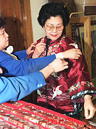 全國人大天津代表、著名民族聲樂歌唱家于淑珍十四日在會議間隙時間,興致勃勃地試穿民族服裝。作者:陳勇