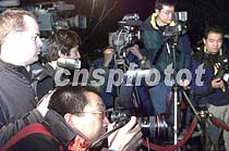 美國駐華大使普理赫十一日晚在北京就美國對撞擊事件的致歉信回答中外記者提問,中外記者紛紛搶拍鏡頭。中新社記者 滿會喬 攝
