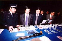 四月十一日下午,深圳市召開(kāi)嚴(yán)厲打擊刑事犯罪分子宣判處理大會(huì),法院對(duì)四十五名罪犯進(jìn)行終審宣判,公安局對(duì)三十名犯罪嫌疑人執(zhí)行逮捕。圖為廣東省委副書(shū)記、深圳市委書(shū)記張高麗(左二)和市長(zhǎng)于幼軍(左三)等市領(lǐng)導(dǎo)在查看公安部門(mén)收繳的槍支、毒品等物。中新社記者 陳文 攝