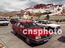 西藏拉薩市目前擁有出祖汽車一千二百輛,近來已更換為上海產的“桑塔納”牌轎車,為外來的游客和當地市民出行提供了方便。中新社圖 吳新華 攝