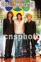 香港歌星謝霆鋒與日本樂壇組合「GLAY」10日在香港舉行記者會,宣布在今年七至八月于日本東京、北海道及九州舉行四場超大型演唱會。會上謝霆鋒與日本樂壇組合「GLAY」其中兩位成員合照。中新社傳真鄧慶樂攝