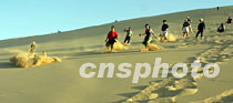 6月12日,“萬里行”鳳凰車隊(duì)在敦煌鳴沙山挑戰(zhàn)極限。圖為將士們登頂后從沙山上順坡而下,齊聲呼喊。中新社圖 魏孝明 攝