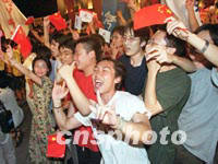 組圖:北京歡慶申奧成功 2001年07月14日 15:41 ![]() 十三日晚北京放煙花歡慶申奧成功。中新社記者 錢興強 攝 ![]() 北京申奧成功,十三日晚在北京中華世紀壇大學生們滿懷激情高呼中國萬歲。中新社記者 錢興強 攝