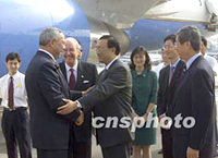 ![]() 美國國務卿鮑威爾二十八日八時十五分抵達北京國際機場,開始對中國的訪問。中新社記者 滿會喬 攝 ![]() 美國國務卿鮑威爾二十八日上午八時十五分抵達北京國際機場,開始對中國的訪問。中國駐美大使楊潔篪和美國駐華大使雷德等前往機場迎接。中新社記者 滿會喬 攝