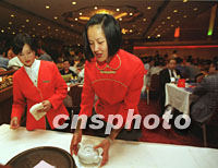 圖:為西部論壇客商服務小姐行唐代禮節 2001年09月05日 18:36 ![]() 西安唐樂宮的服務員五日以唐代禮節為參加西部論壇的賓客準備茶水,會上近二百家國內外企業的代表在此進行了項目洽談。中新社記者 宋吉河 攝