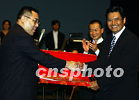 組圖:周潤發(fā)出席澳門國際音樂節(jié) 2001年10月05日 18:57 ![]() 由奧斯卡金像獎獲得者譚盾(右一)指揮、由多名國際音樂家和上海交響樂團(tuán)演出的"臥虎藏龍"音樂會,4日晚在"第十五屆澳門國際音樂節(jié)"演出成功后,周潤發(fā)向音樂家表示祝賀。中新社圖 任晨鳴 攝 ![]() 香港巨星周潤發(fā)4日到澳門出席"第十五屆澳門國際音樂節(jié)"中的"臥虎藏龍"音樂會后,澳門特區(qū)政府社會文化司司長崔世安向周潤發(fā)頒發(fā)紀(jì)念品。中新社圖 任晨鳴 攝