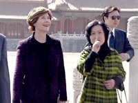 美國總統布什的夫人勞拉二十一日在中方人員陪同下興致勃勃地游覽故宮。