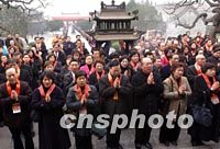 圖:臺灣佛教人士在西安大慈恩寺做法事 2002年02月22日 13:59 ![]() 由臺灣佛教人士組成的法門寺佛指舍利赴臺灣地區瞻禮(供奉)恭迎團,二十二日來到西安大慈恩寺做法事。中新社記者 錢興強 攝