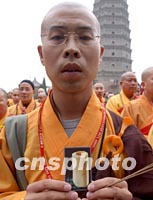 組圖:佛指舍利赴臺恭送法會在法門寺隆重舉行 2002年02月22日 20:12 ![]() 法門寺佛指舍利赴臺灣地區瞻禮(供奉)法會二十二日在西安法門寺舉行,來自臺灣的恭迎團,由大陸佛教人士組成的護送團以及護法團等各界有關人士千余人匯集法門寺。圖為佛家弟子向佛指舍利獻哈達。中新社記者 錢興強 攝 ![]() 法門寺佛指舍利赴臺灣地區瞻禮(供奉)法會二十二日在西安法門寺舉行,來自臺灣的恭迎團,由大陸佛教人士組成的護送團以及護法團等各界有關人士千余人匯集法門寺。圖為一法師手捧佛指舍利圖片念經。中新社記者 錢興強 攝