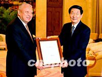 朱镕基會見董建華 中央全力支持香港恢復(fù)經(jīng)濟 2002年03月07日 15:11 ![]() 中國總理朱镕基七日上午在北京人民大會堂香港廳,向連任香港特別行政區(qū)第二任行政長官的董建華先生頒發(fā)任命書。中新社記者 賈國榮 攝