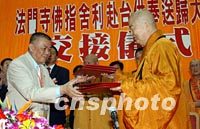 ![]() 赴臺(tái)供奉三十七天的法門寺佛指舍利三十一日抵達(dá)陜西咸陽(yáng)機(jī)場(chǎng),并舉行了交接儀式。圖為臺(tái)灣佛教界恭迎委員會(huì)主任委員星云法師(右)與中國(guó)佛教協(xié)會(huì)副會(huì)長(zhǎng)刀述仁先生在交接儀式上。中新社圖 武仲林 攝