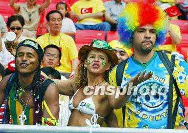6月3日下午,韓日世界杯C組巴西與土耳其隊的比賽正在韓國蔚山文竹體育場進行。圖為看臺上身穿比基尼的女球迷。