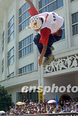 中國極限精英賽十日在北京工人體育館舉行,北京選手在滑輪街式比賽中的高難度騰空動作令人驚嘆。 作者:史利