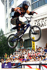圖:中國極限精英賽街市決賽 2002年08月12日 16:30 ![]() 北京選手于秒在八月北京舉行的中國極限精英賽街市決賽中,高空雙手撒把體現了極限運動的驚險刺激。作者:史利