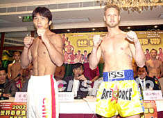 ![]() 2002世界泰拳金腰帶慈善大賽組委會十六日在澳門舉行新聞發布會,綽號“怪俠三毛”的中國選手王三楨(左)在會上與對手共同亮相。李剛 攝