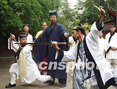 來自武當派的英杰,由原太和宮主持、武當道教文化研究會會長游玄德宗師掌門率隊。武當派高手袁理敏、游小龍、游尊龍、周理參、黃理安等赴賽。著一身道服,頭戴莊子帽的游玄德在臺上將武當秘傳太極拳和神秘的內家功夫實戰演藝首次公開亮相,幾個招式,便贏得滿場喝彩。武當派內家祖庭十五代弟子游小龍的武當醉八仙劍,演示得似醉非醉、云里霧里、劍法凌厲多變。