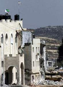中新網9月22日電 據人民網報道,圍困巴勒斯坦領導人阿拉法特官邸的以色列士兵為了達到讓這位老人屈服之目的,21日發起了“越發無禮”的舉動,他們除了繼續摧毀阿拉法特的“非關鍵”辦公室外,甚至將以色列旗幟插上了官邸大樓。當天深夜,以軍士兵通過高音喇叭要求大樓內的200多人立刻撤走,否則將面臨“與大樓同歸于盡的命運”。國際社會則繼續要求雙方通過和平談判來解決存在的問題。