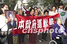 在日本殖民統治時期被強征為“慰安婦”的幾名臺灣老人要求日本政府謝罪、賠償,她們的訴訟請求十五日被東京地方法院駁回。圖為老人們在法院前抗議不公正判決。作者:陶光雄